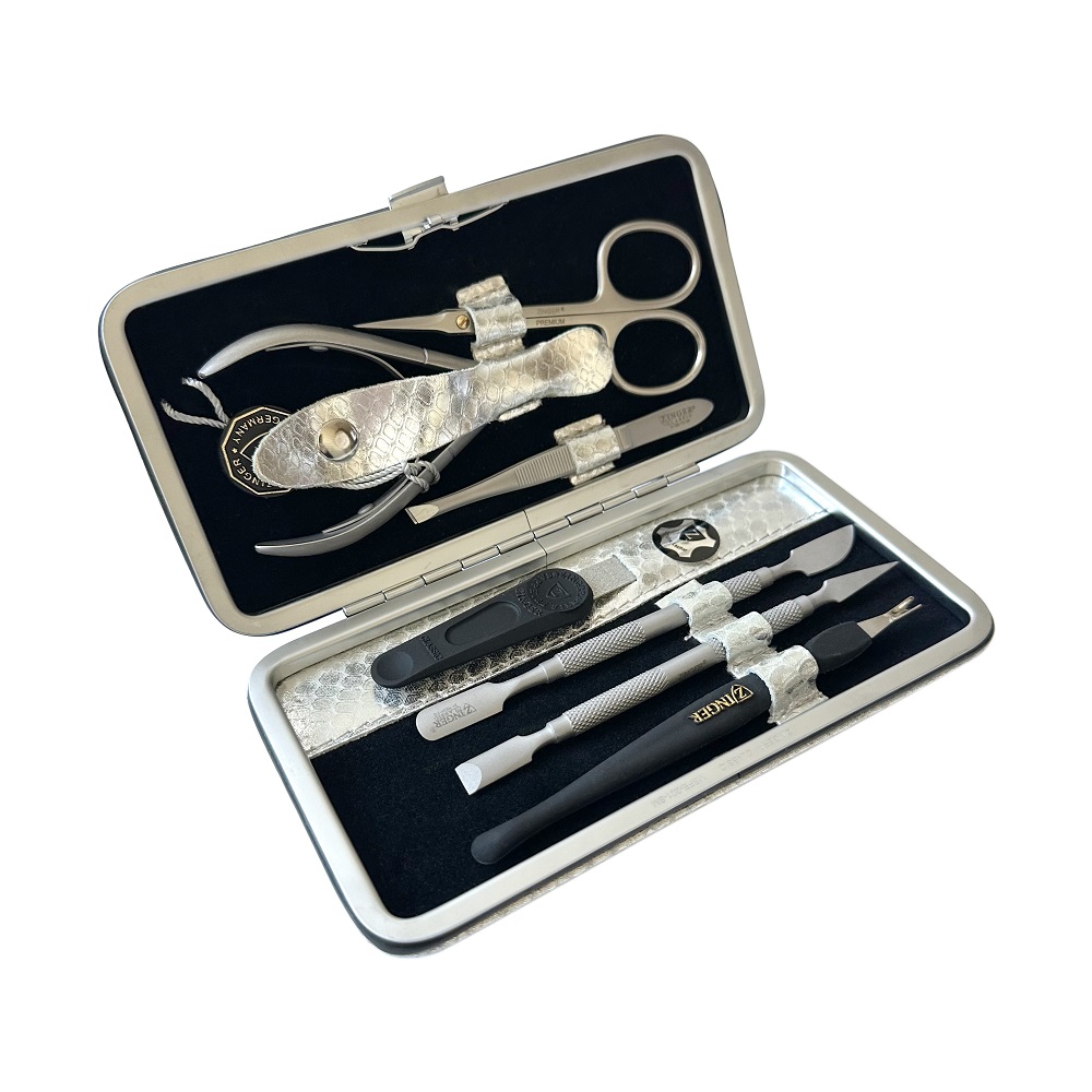Состоит из 7 предметов: - кусачки для кутикулы, - ножницы, - пинцет, - металлическая пилка, - 2 металлических шабера разного размера (палочки для отодвигания кутикулы и чистки ногтя), - триммер (V образная палочка для обрезания кутикулы).