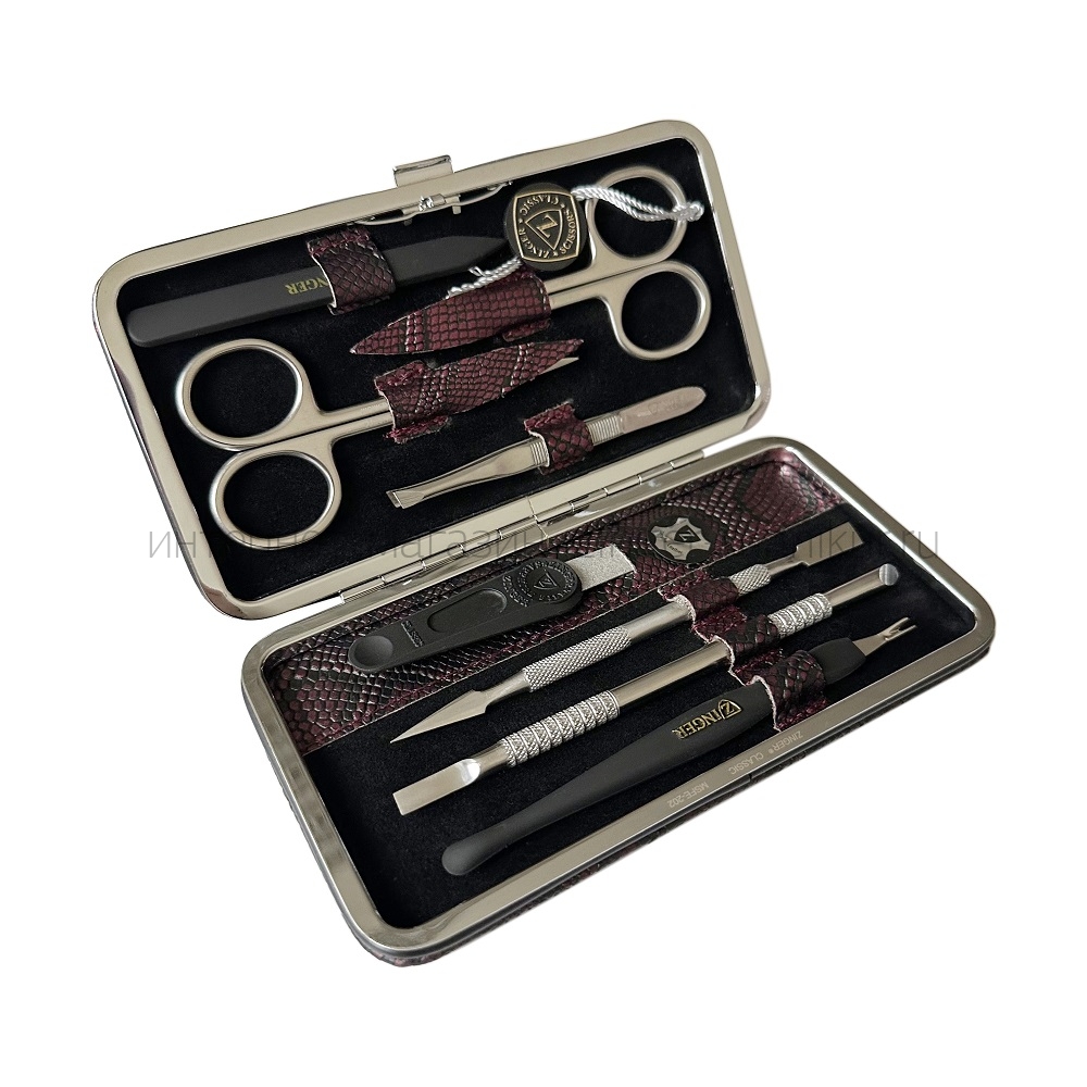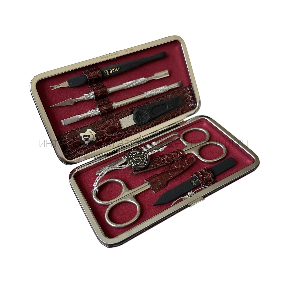 Классический маникюрный набор ZINGER MSFE-202 из 8 предметов. Компактный и стильный. Футляр кожа, защёлка автомат. Внутренняя отделка футляра - мягкий велюр, имитация замши, цветом в тон коже футляра. Подарочная коробка с логотипом, внутри отделана бархатной бумагой.
